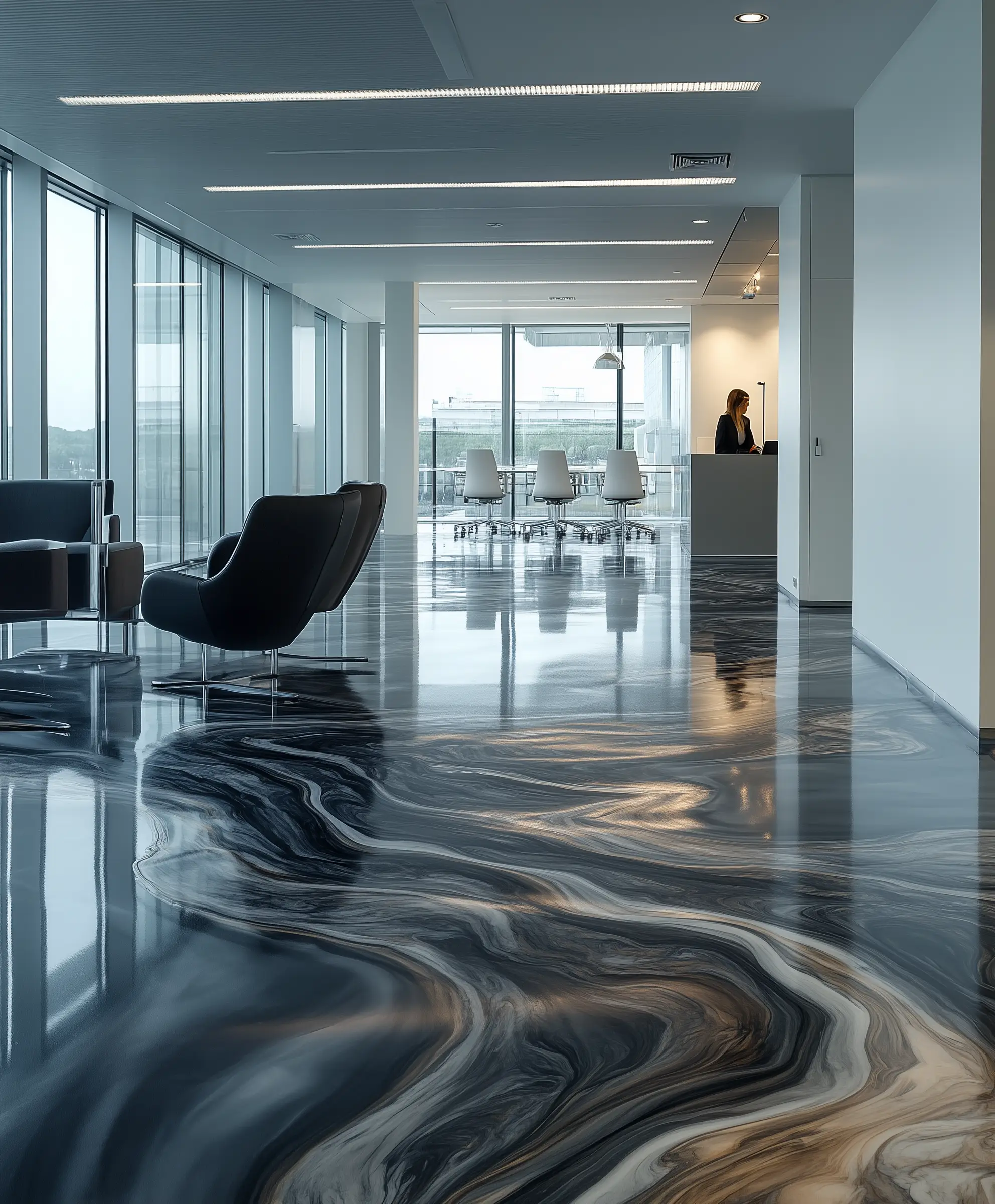 Améliorez votre environnement professionnel avec un sol en époxy résistant et esthétiquement plaisant. Parfait pour les bureaux, espaces de vente et showrooms, nos solutions commerciales allient durabilité et design moderne pour un rendu professionnel.